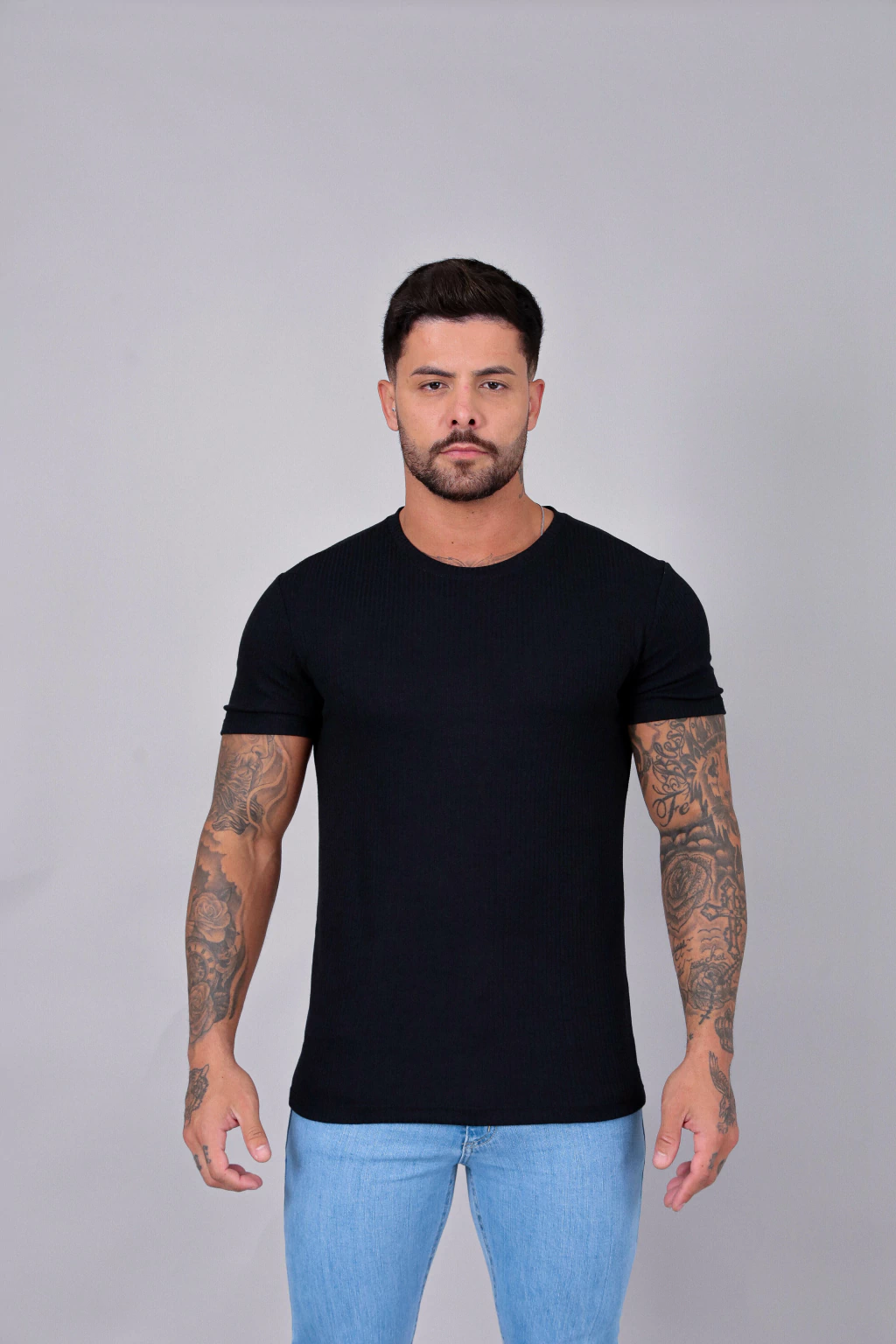 A Camiseta confeccionada em malha canelada é a combinação perfeita de estilo casual e conforto duradouro. Com textura discreta e moderna, ela oferece um visual mais sofisticado mesmo nas produções do dia a dia.